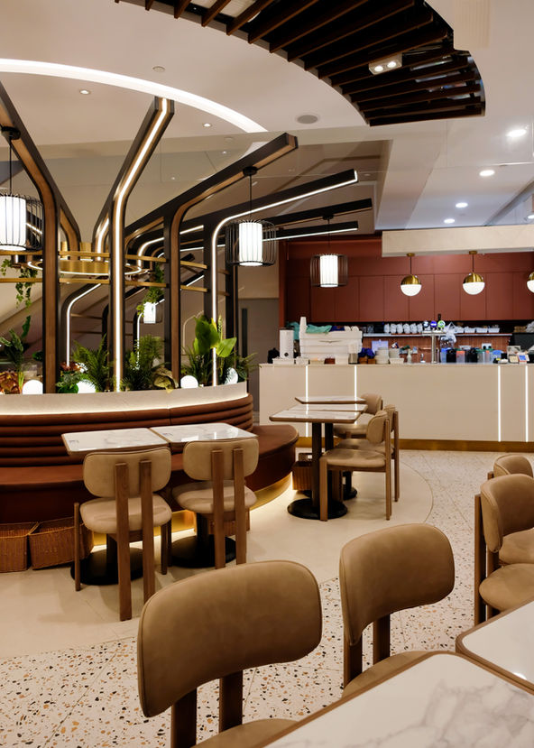 Grove Cafe at Scramble Hill is an open-plan restaurant located at the central ground-floor zone of SHKP’s newest landmark mall in Kwun Tong. Designed as an expanded kiosk concept, the project redefines spatial boundaries through sculptural forms, integrated lighting, and planter-defined edges. The result is a warm, refined dining destination that maintains strong brand presence while harmonizing with the mall’s architectural language.