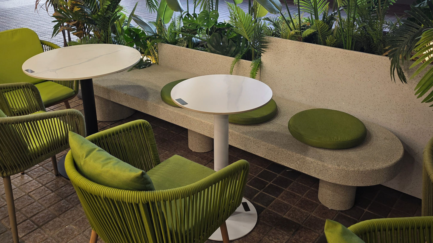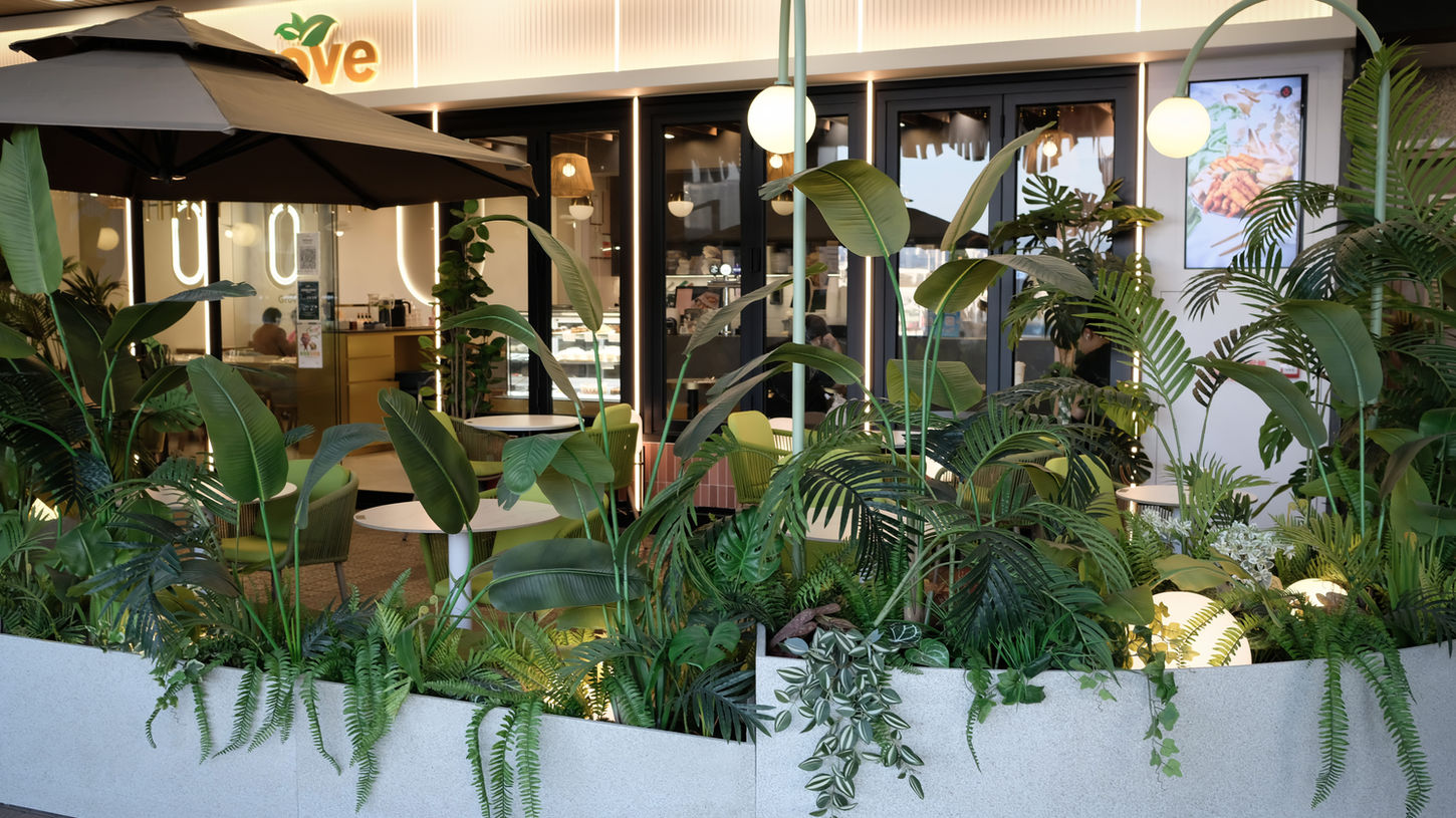 Durable large-format stone or porcelain paving was selected for the flooring to accommodate high pedestrian traffic while maintaining a clean and refined visual continuity with the surrounding commercial plaza. The neutral tone allows the greenery and furniture to remain the visual focus of the space.