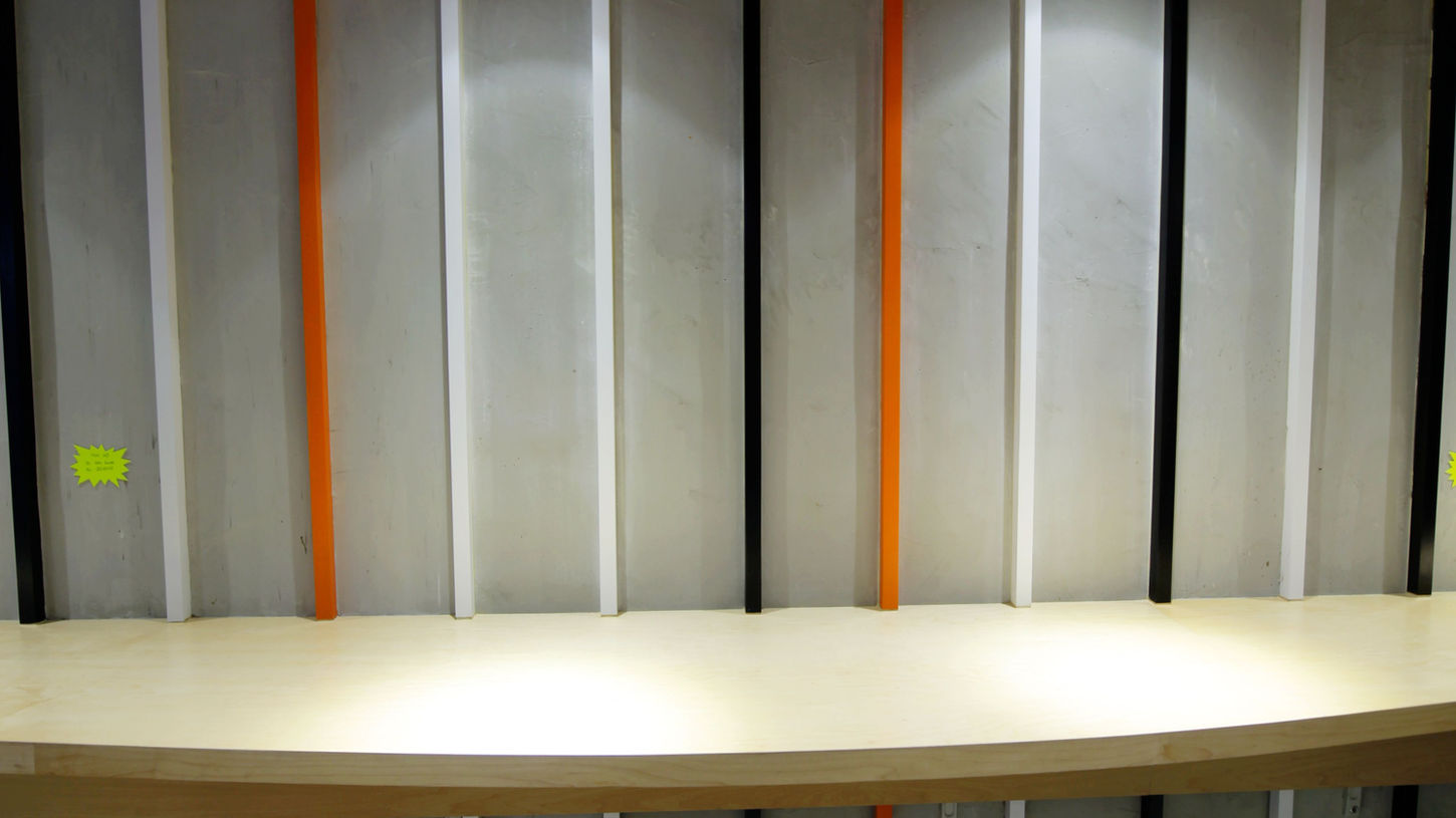 Concrete flooring with directional graphics, plywood counters, and modular steel ceiling frames form a clean, rhythmic environment that enhances flow and clarity.