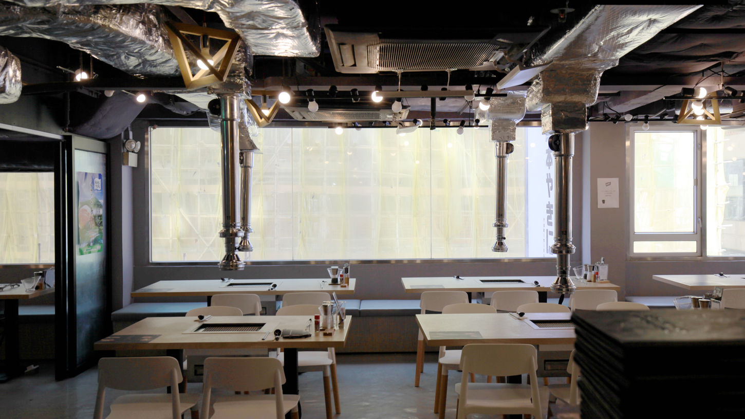 The 3,000 sqft space was planned with maximum seating flexibility — long banquette sofas along the windows and compact tables with in-built grills in the central zone. The spatial rhythm is defined by a consistent alignment of smoke-extraction ducts and track lighting, maintaining both visual order and operational efficiency. The open ceiling enhances air volume while the reflective ductwork adds a touch of urban realism.