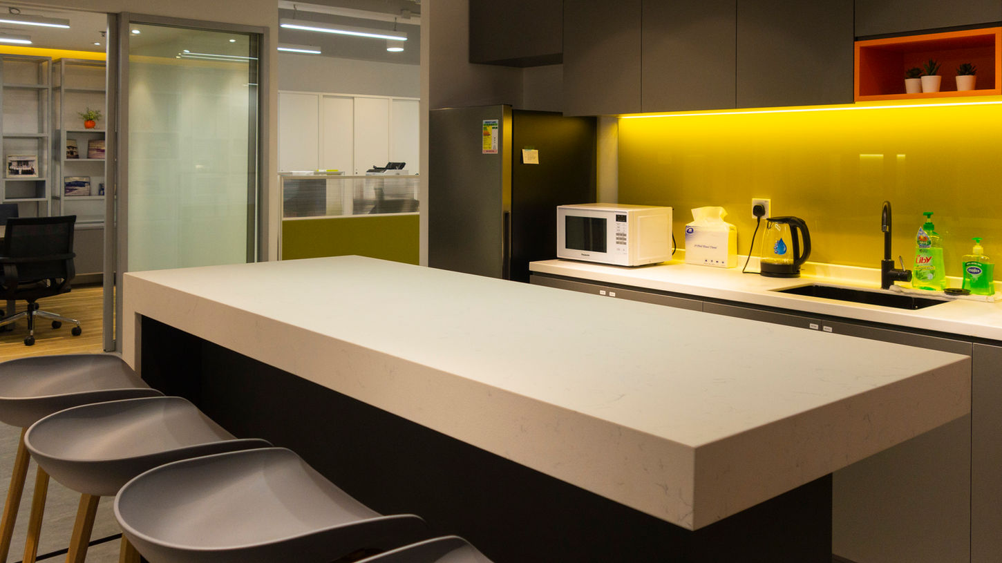 Pantry & Social Hub – A bold yellow backsplash and modern island bar promote casual interaction and foster a strong internal team culture.